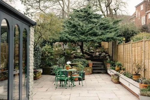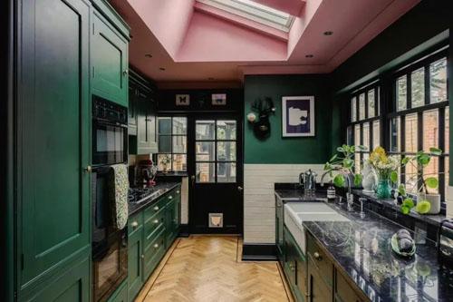深綠+粉色+黑色,很難想到一起的顏色組合,但這里搭配出來很英式很和諧。配合牛排煎漢堡煎牛肉干,烤土豆煎炸薯條煎土豆泥這些英式菜來說,這樣的廚房足夠了。主人把廚房和后花園打通,還搭建了個玻璃陽光房,打造了一個燒烤的好地方,這點很吸引人。