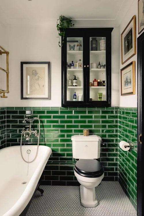 綠色面包磚的色彩彩的非常不一樣,像是祖母綠寶石一樣,透露出一種低調高貴的復古風情。貝殼紋的馬賽克瓷磚,帶來一陣愜意清透的涼風。掛畫、綠植的點綴,以及金屬、玻璃的凌冽,送上一襲沁人心脾的舒適溫度。