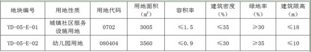 將E-01地塊用地性質由原二類城鎮住宅用地調整為城鎮社區服務設施用地,E-02地塊由原二類城鎮住宅用地調整為幼兒園用地,并依據調整后的用地性質賦予地塊相應控制指標,詳見下圖、下表。