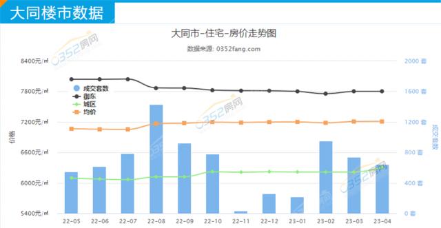 2022年4月大同樓市總成交套數570套左右,總成交面積約7.2萬平方米,總成交額約5.3個億;同比來看,2023年4月大同樓市成交數據與去年同期相比有所上升。