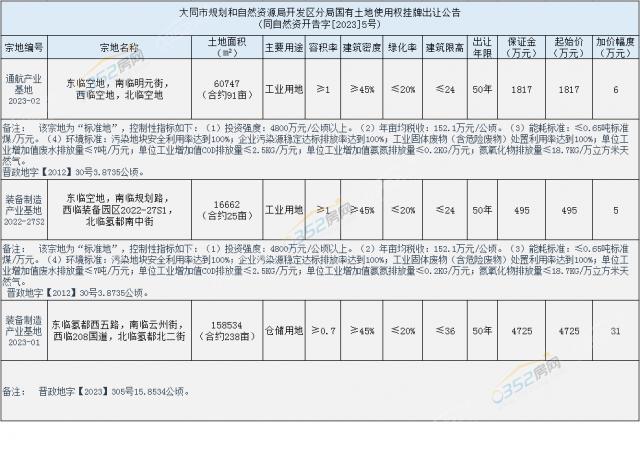 摘要:據(jù)相關(guān)網(wǎng)站公告,大同市開(kāi)發(fā)區(qū)有3宗土地即將掛牌出讓?zhuān)偯娣e約354畝,詳情整理如下。