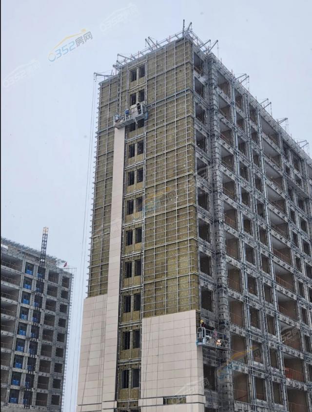 華遠天瀛,主樓外裝飾幕墻龍骨施工完畢,項目西側外墻干掛石材正在進行中。