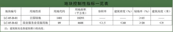 規(guī)劃確定LC-05-B-01地塊用地性質(zhì)為公園綠地(1401),用地面積1.83公頃;LC-05-B-02地塊用地性質(zhì)為商業(yè)服務(wù)業(yè)設(shè)施用地(09),用地面積0.47公頃。依據(jù)規(guī)劃用地性質(zhì)賦予地塊相應(yīng)控制性指標。