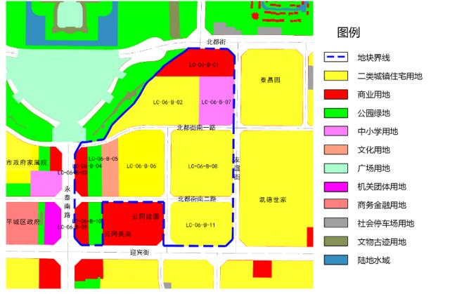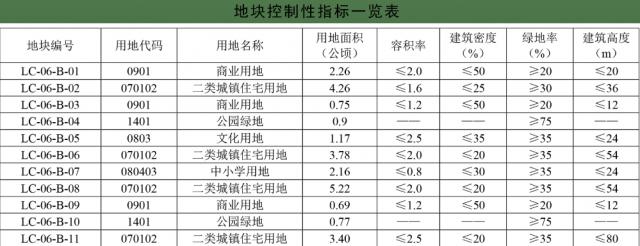 規(guī)劃確定LC-06-B-01、LC-06-B-03、LC-06-B-09地塊用地性質(zhì)為商業(yè)用地(0901),用地面積3.7公頃;LC-06-B-02、LC-06-B-06、LC-06-B-08、LC-06-B-11地塊用地性質(zhì)為二類城鎮(zhèn)住宅用地(070102),用地面積16.66公頃;LC-06-B-04、LC-06-B-10地塊用地性質(zhì)為公園綠地(1401),用地面積1.67公頃;LC-06-B-05地塊用地性質(zhì)為文化用地(0803),用地面積1.17公頃:LC-06-B-07地塊用地性質(zhì)為中小學(xué)用地(080403),用地面積2.16公頃。依據(jù)規(guī)劃用地性質(zhì)賦予地塊相應(yīng)控制性指標(biāo)。