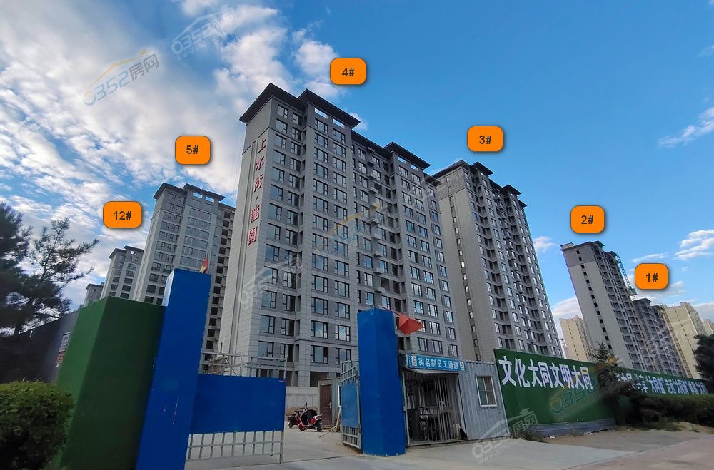 上水灣龍園南側樓棟建設較快,外立面裝飾中;其余樓棟進行外保溫建設。。