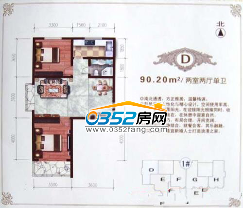 D戶型,建面約90.20㎡(兩室兩廳單衛)