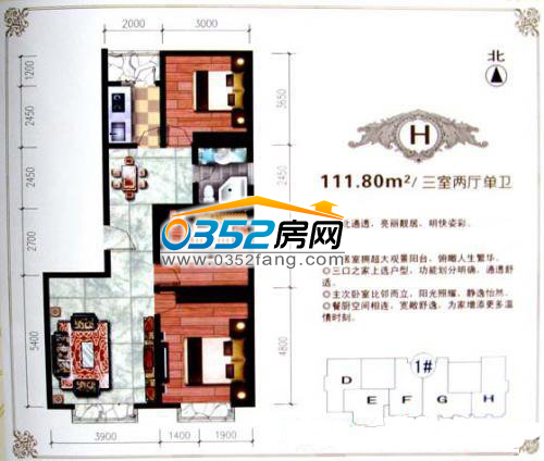 H戶型,建面約111.80㎡(三室兩廳單衛)