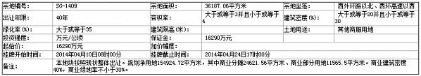 六、 本次國(guó)有土地使用權(quán)掛牌活動(dòng) 在 太原市國(guó)土資源交易事務(wù)中心(太原市金剛堰路2號(hào)國(guó)土大樓一層) 進(jìn)行。各地塊掛牌時(shí)間分別為:SG-1409 號(hào)地塊:2014年04月10日08時(shí)00分 至 2014年04月24日17時(shí)00分 ;