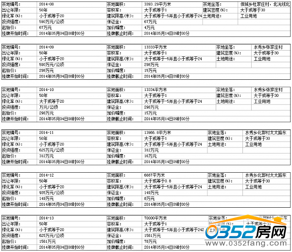 5、本次出讓的所有宗地的成交價款不包括測繪費、地價評估費、地質災害評估費和交易費,(其中 2014-09號到2014-15號宗地成交價款中不包括耕地占用稅)。其他詳細資料和未盡事宜,詳見出讓文件。