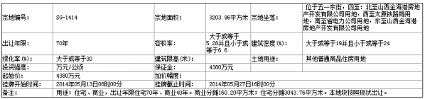 六、本次國有土地使用權掛牌活動 在 太原市國土資源交易事務中心(太原市金剛堰路2號太原國土大樓一層) 進行。各地塊掛牌時間分別為:SG-1414 號地塊:2014年05月13日08時00分 至 2014年05月27日16時00分 ;