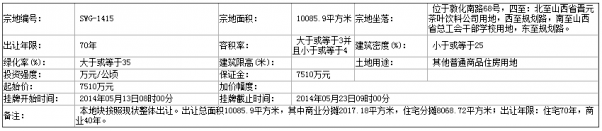 六、本次國有土地使用權掛牌活動在網掛系統進行。各地塊掛牌時間分別為:SWG-1415號地塊:2014年05月13日08時00分至2014年05月23日09時00分;