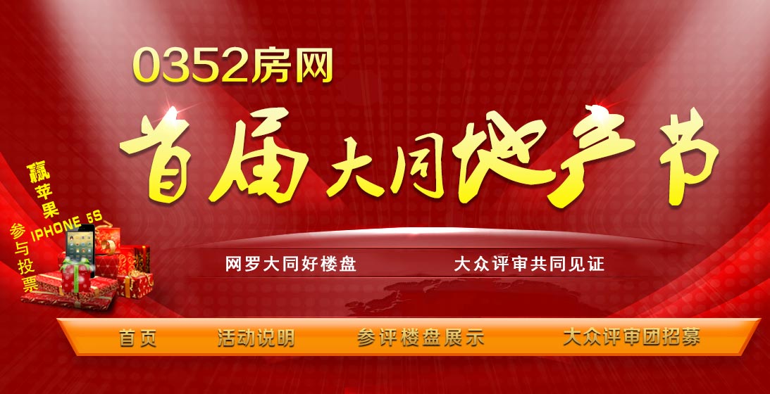 0352房網大同地產節是年末大同地產界的重大節日,旨在通過業內人士與網友的共同關注,評選出樓盤相對應的獎項,2014年是第二屆,本次網絡投票可實名或者匿名,望廣大網友能客觀投下您神圣的一票,對于無效的投票信息將視為廢票并作廢。凡投票網友并且登記個人信息,將有機會獲得充電寶,水杯,電飯煲,精美茶具,山地車等禮品,更有終極大獎iPhone6等您來拿,歡迎廣大網友踴躍投票。本次網絡投票禁止所有參評項目刷票現象,一經發現有刷票現象,系統會清理刷票增加數據,恢復原來數據!